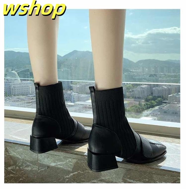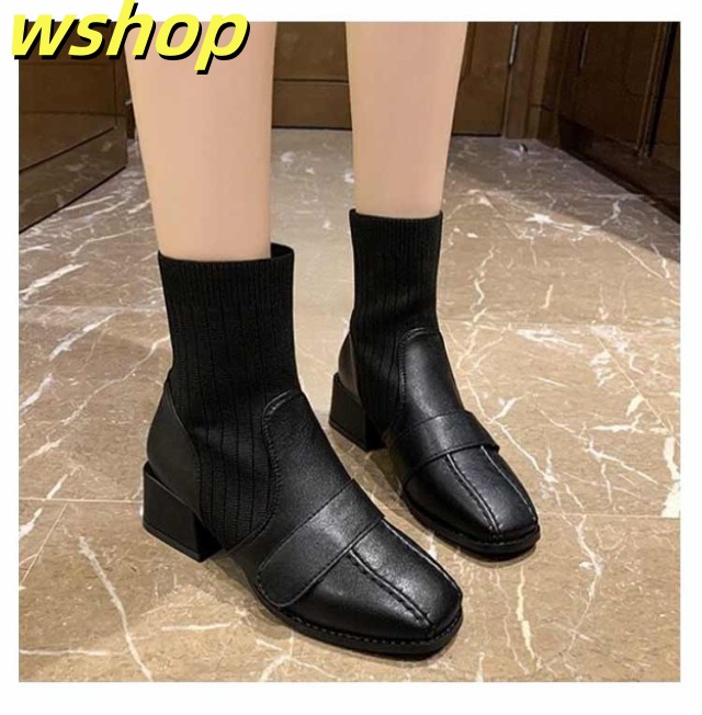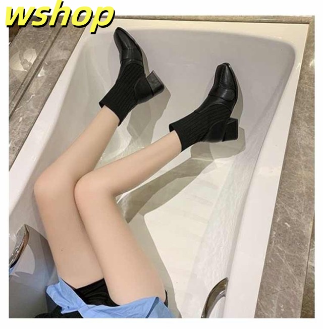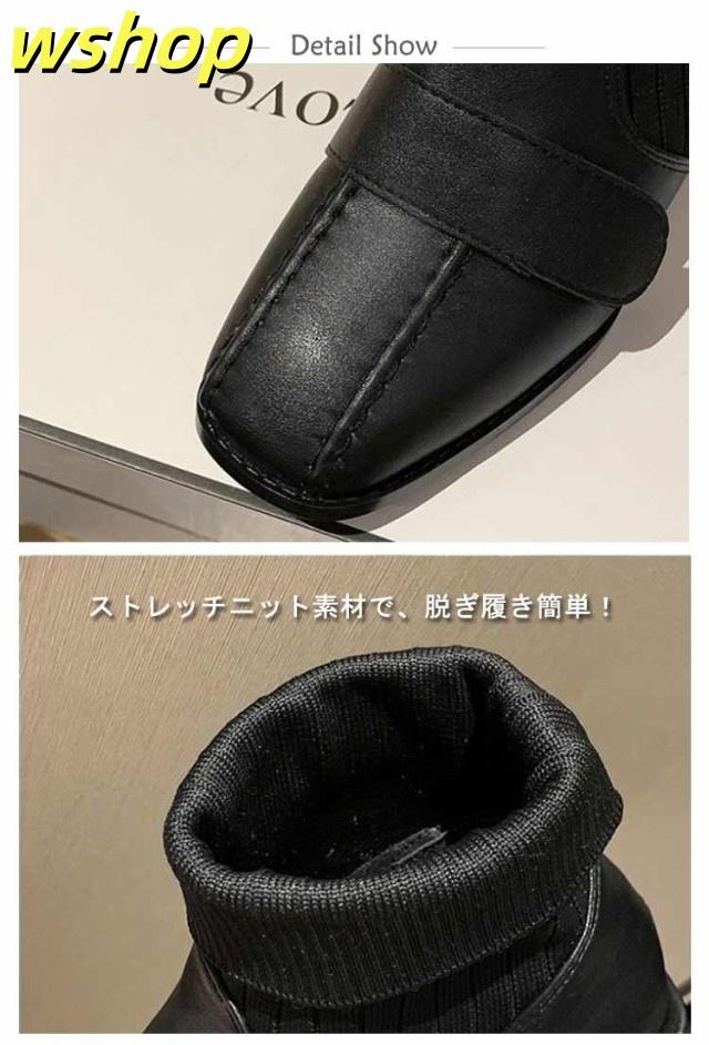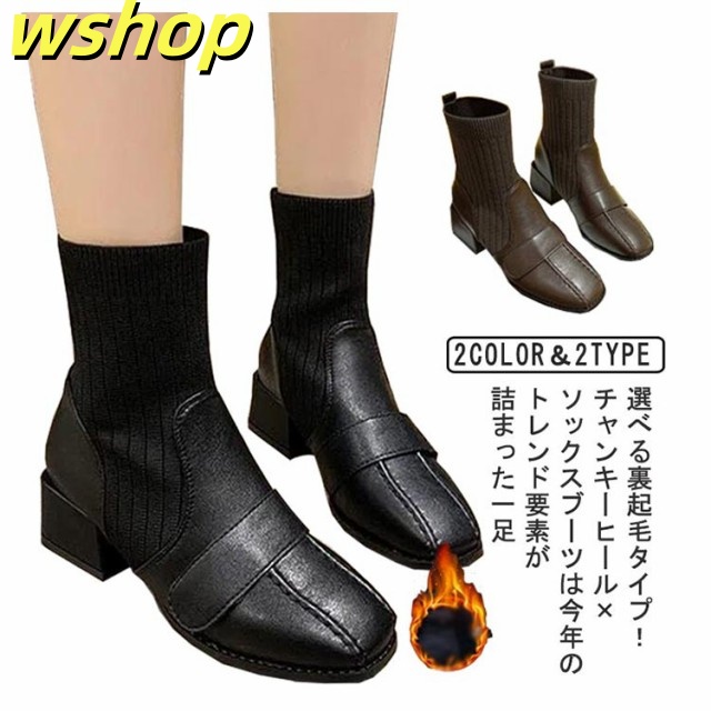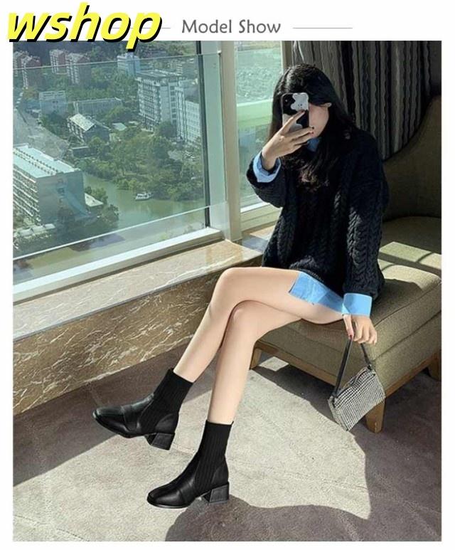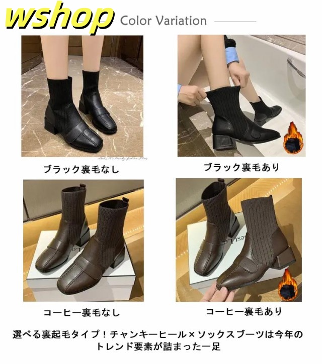 【wshop 】チャンキーヒール ブーツ レディース ショートブーツ ニットブーツ 4.5cmヒール 秋冬 歩きやすい 太ヒール ギフト ソックスブーツ 可愛い ショート丈 シューズ ストレッチブーツ 履きやすい 美脚 おしゃれ 疲れない 韓国ファッション 大人女性 リブニット