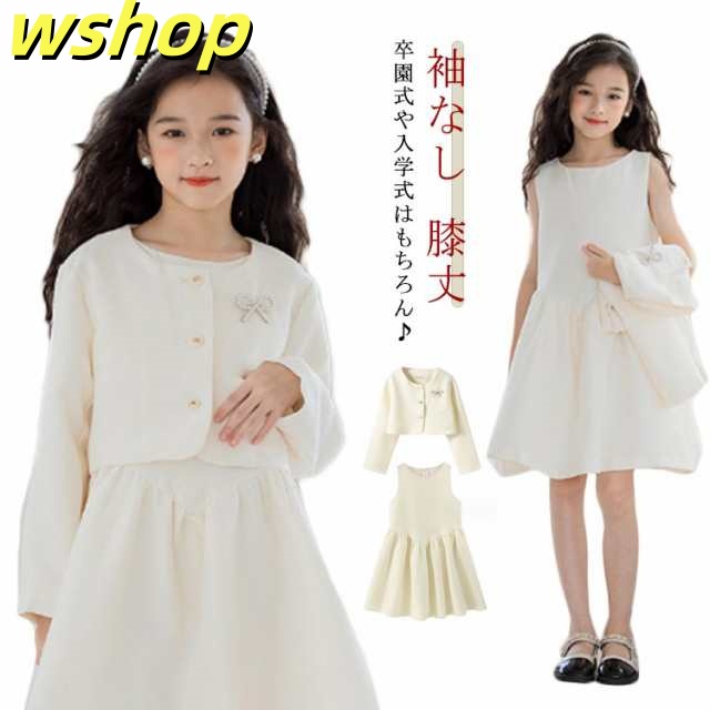 女児 女の子 フォーマル 入学式 ボレロ ワンピーススーツ スーツ 子供服 セットアップ ワンピース ジャケット ジャンスカ ノースリーブ 上下セット 袖なし 膝丈 オフホワイト ガールズ フォーマル 秋 結婚式 七五三 春