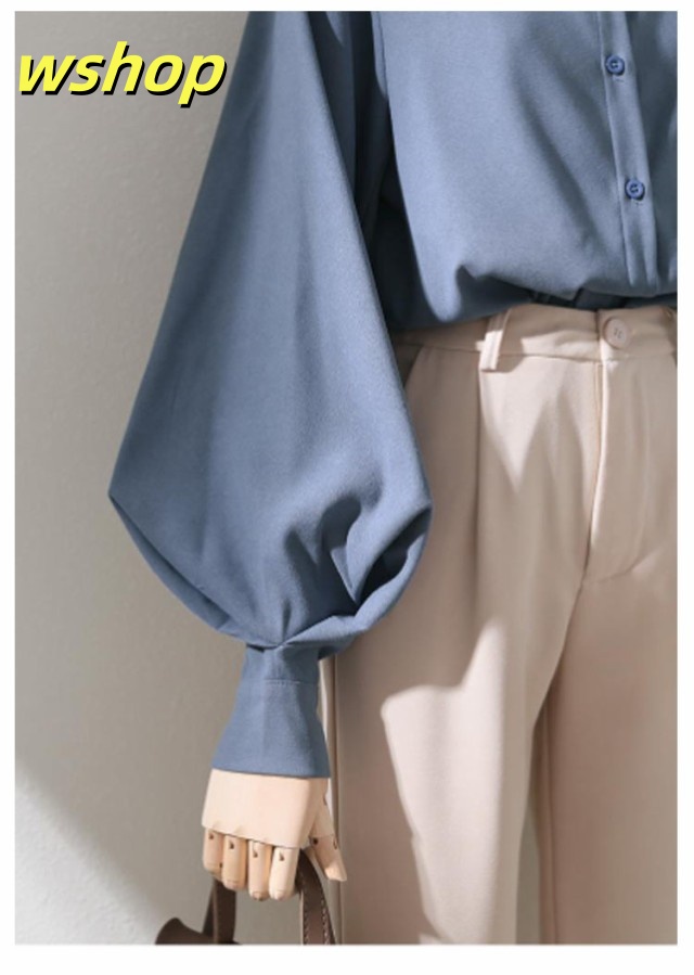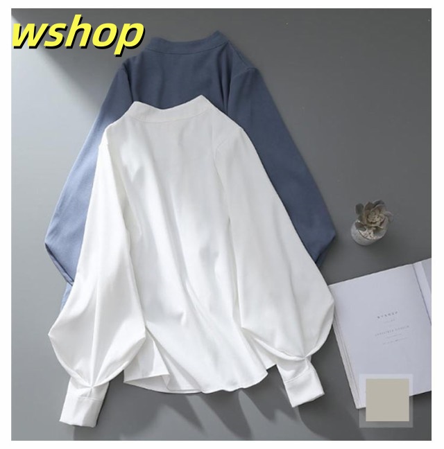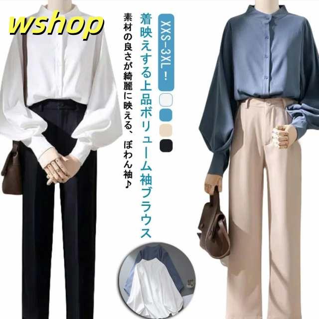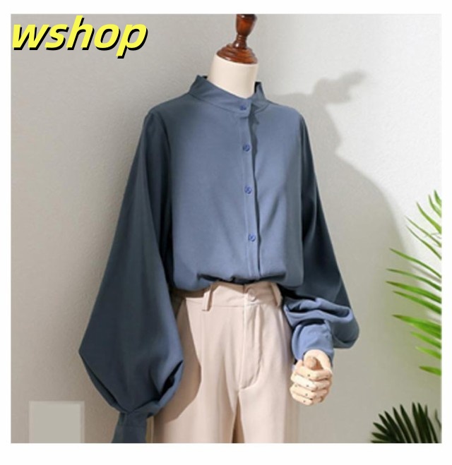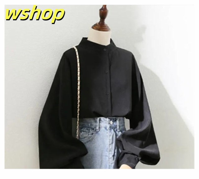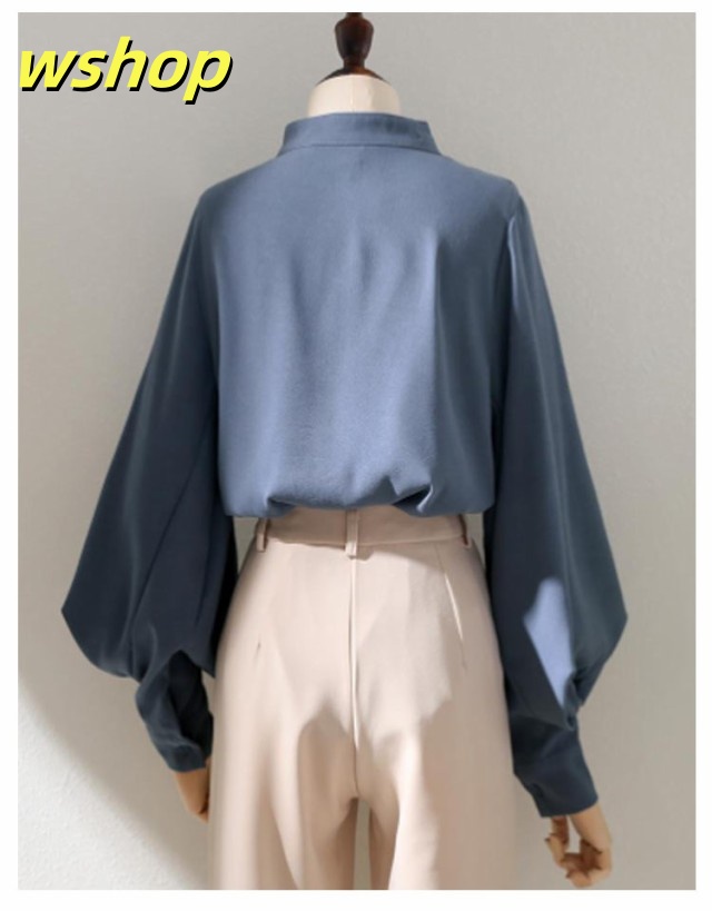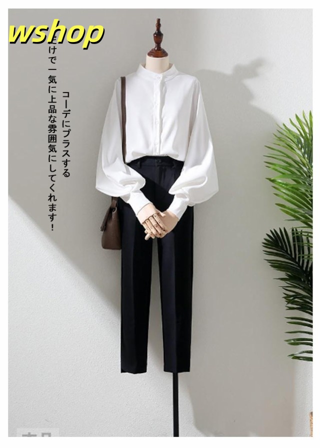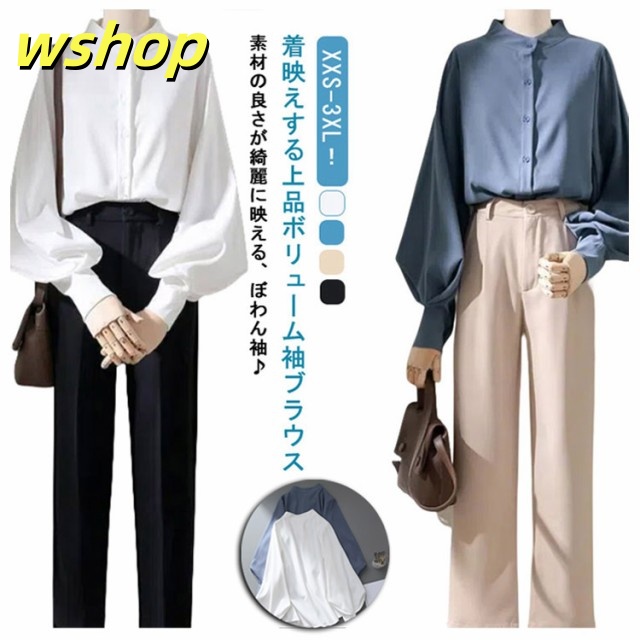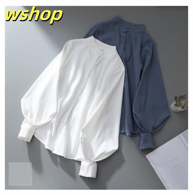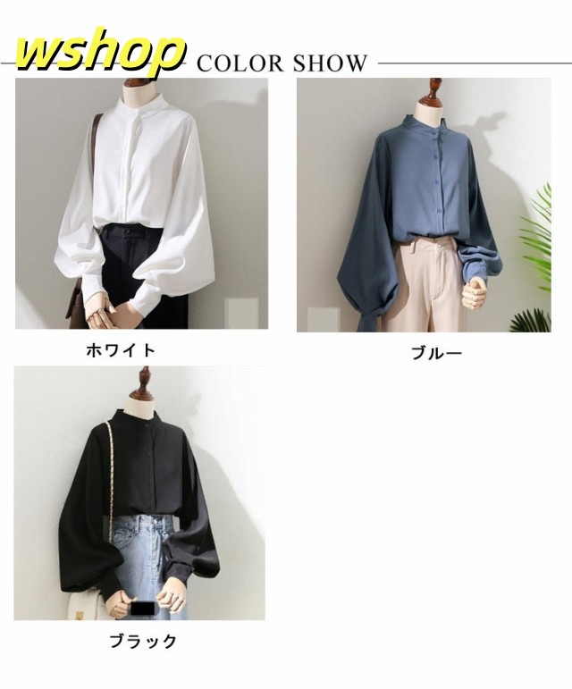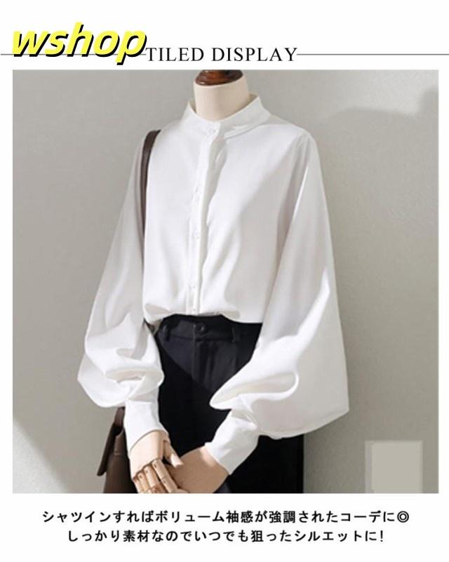 即納OK レビュー高評価 トップス ブラウス カジュアル 通勤 】ブラウス レディース ゆったり 薄手 ボリューム袖 シャツ 事務服 送料無料 無地 スタンドカラー 白ブラウス 長袖 きれいめ バルーン袖 大きいサイズ ビジネス オフィス 【wshop フェミニン 立ち襟 今だけ限定