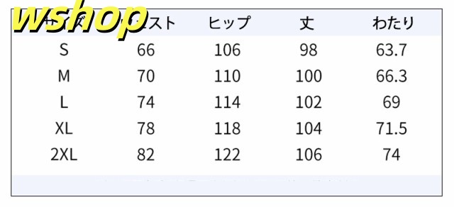 | サイズについての説明 | ●サイズ: S,M,L,XL,XXLS ウェスト66 ヒップ106 総丈98M ウェスト70 ヒップ110 総丈100L ウェスト74 ヒップ114 総丈102XL ウェスト78 ヒップ118 総丈104XXL ウェスト82 ヒップ122 総丈106 |