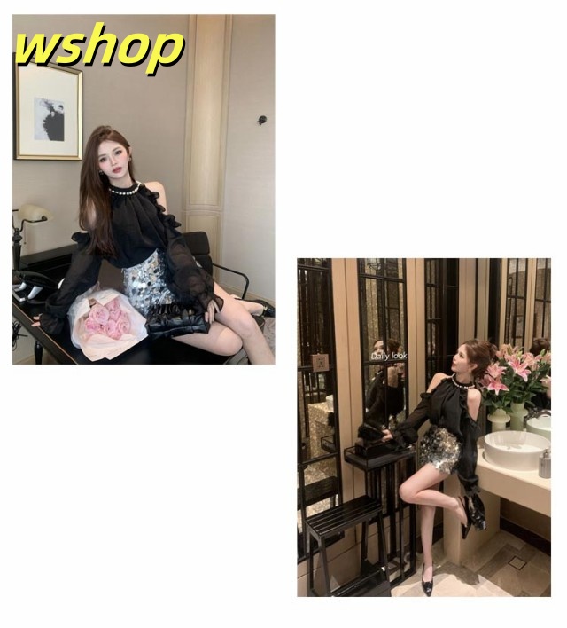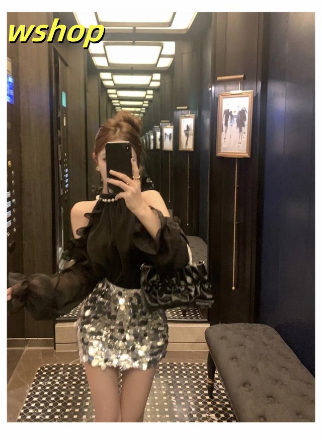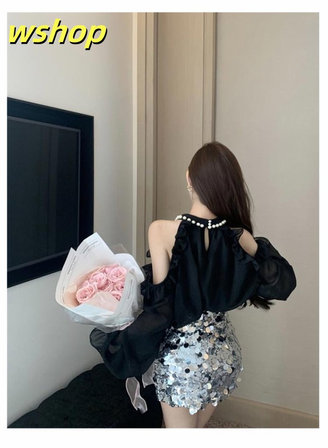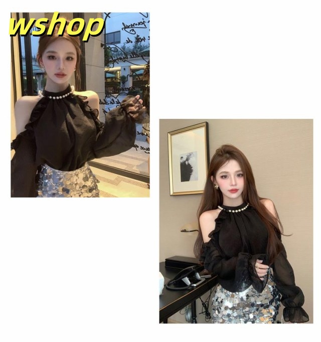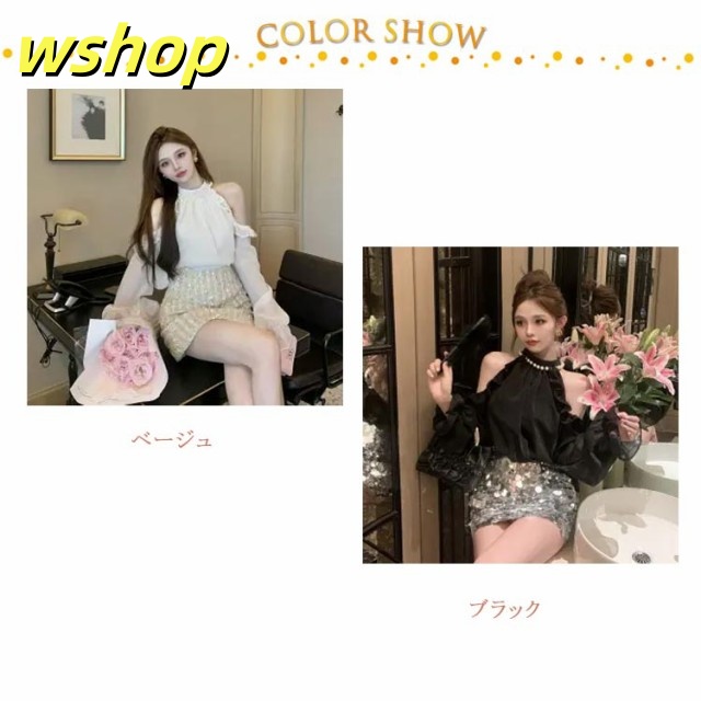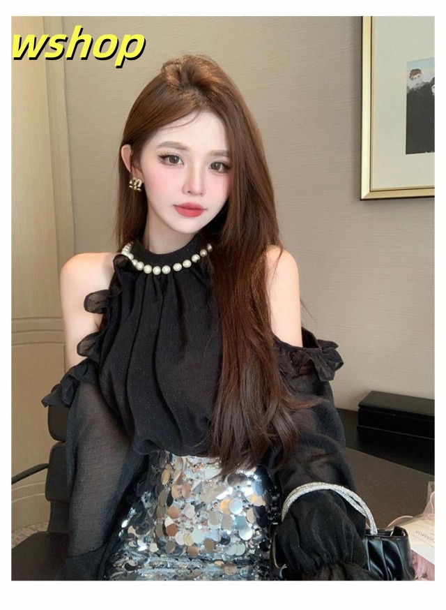 パール調 シフォン オフショルダー オフショルブラウス ブラウス シフォンシャツ レディース かわいい 30代 シャツ ホルターネック 大人 50代 肩出し パール調 長袖 パーティー トップス 40代 二次会 ブラック ベージュ S M L