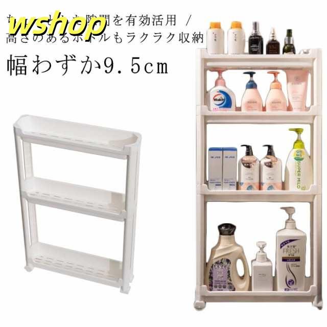 | 幅わずか9.5cm ちょっとした隙間を有効活用 / 高さのあるボトルもラクラク収納 各段の高さが異なるので、いろんなものを収納しやすい。スペースを一番有効活用できます。 たった幅9.5cm、気になる食器棚の横やレンジ台の脇など、調味料や飲料水のストックに使ったり、ちょっとした隙間にスッと収納できます。 キッチン以外でも使え、色んな場所で大活躍します。洗面所ではランドリーや洗面の隙間の収納、トイレではペーパーホルダーラックとしても使えます。 ランドリーにあるわずかなデットスペースに洗剤やシャンプー、石けんをストックできるスペースがつくれるワゴンです。 プラスチック製で棚板に穴あき仕様で、濡れても水がたまらないから、お掃除も簡単です。 ネジもなく、工具不要で組立簡単です。はめ込むだけなので、女性一人でも簡単に組み立てることができます。 安定感抜群の脚も移動がラクラクのコロも両方付属で、シーンやお好みに合わせてご利用いただけます。 | |