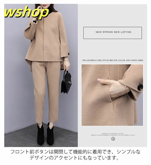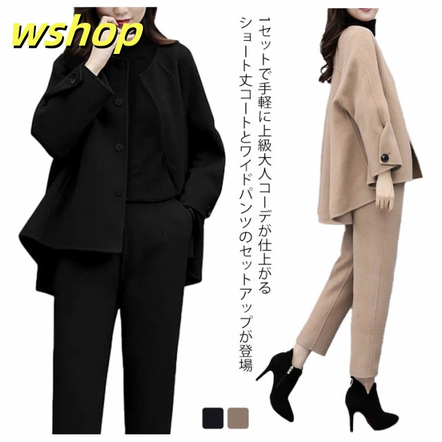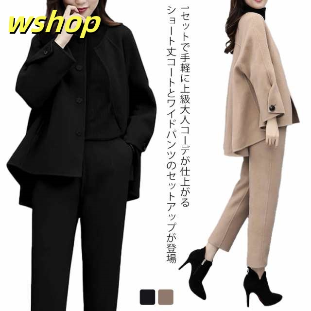 | 1セットで手軽に上級大人コーデが仕上がるショート丈コートとワイドパンツのセットアップが登場。 大人の女性に嬉しい上品で洗練された雰囲気を演出してくれます。 簡単お洒落にカーデのような優しげに着こなせます。 首元は優しいラウンドネックになったトップスは、首周りをキレイに魅せます。 フロント前ボタンは開閉して機能的に着用でき、シンプルなデザインのアクセントにもなっています。 七分袖のワイド袖が垢抜けた印象を与え、控えめな露出とのバランスが絶妙です。 セットのワイドパンツは裾にラインを付け足元にも抜け感をプラスしています。 歩くたび目を引くディテール。 ワイドなストレートラインで美脚効果も抜群です。 20代、30代、40代、50代と多くの方におすすめな上下セット、普段使いはもちろん、入学式・入園式、卒業式・卒園式など様々なシーンでおすすめなセットアップです。 | |