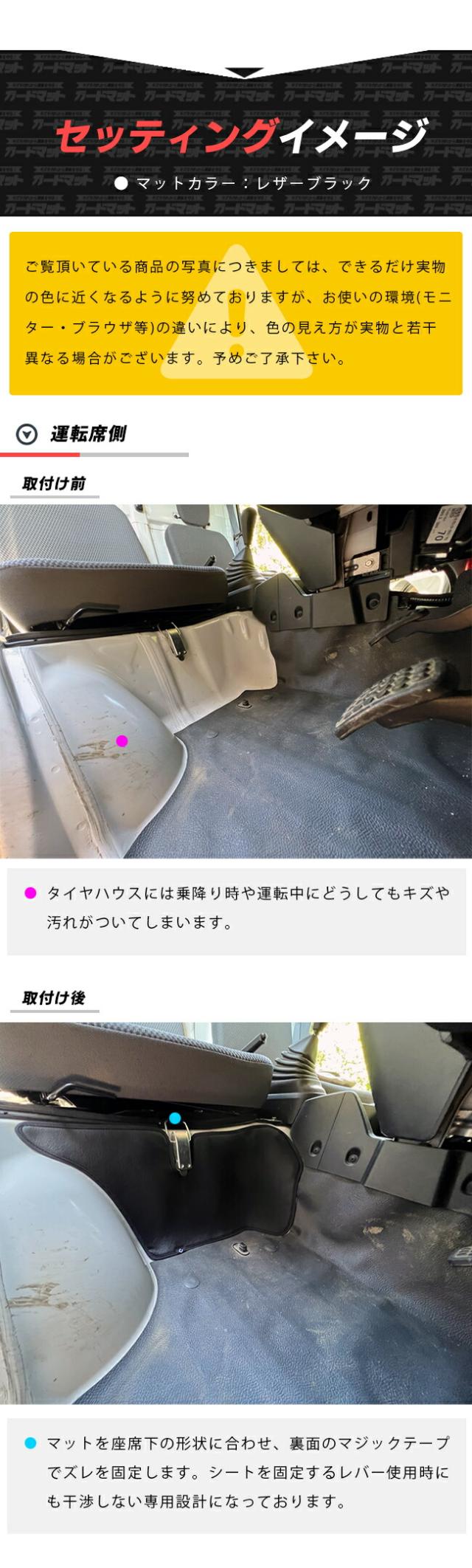 | 商品説明 | ダイハツ ハイゼットトラック専用のガードマットは、車内の美観を保つためのアイテムです。座席下に設置することで、キズや汚れから車をしっかりと守ります。内装をカスタムし、ドレスアップを楽しむことができ、耐久性に優れた素材で作られております。お手入れも簡単で、車内を常に清潔に保つことができます。 |