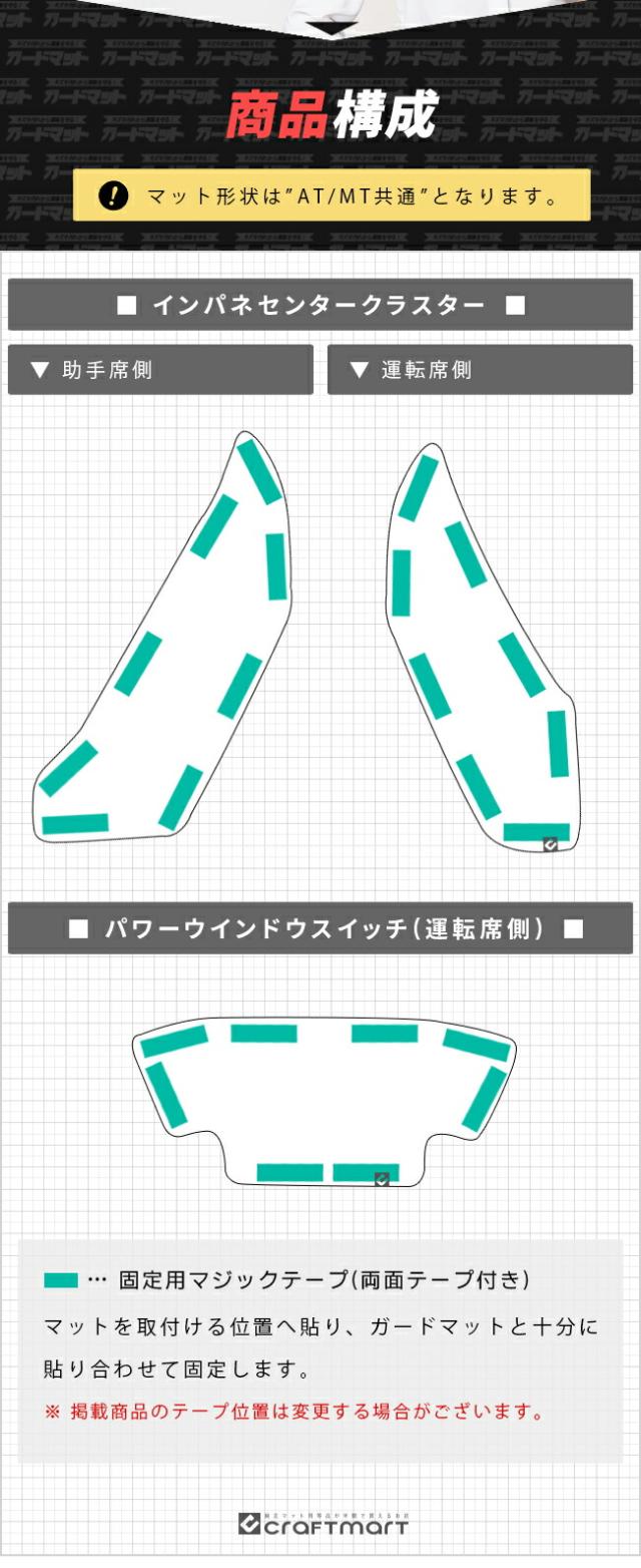 | 商品構成 | インパネセンタークラスター用ガードマット 2枚 パワーウインドウスイッチ用ガードマット 1枚 ※ マット形状は”AT/MT共通”となります。 |