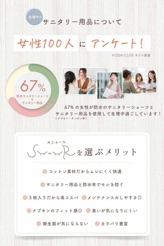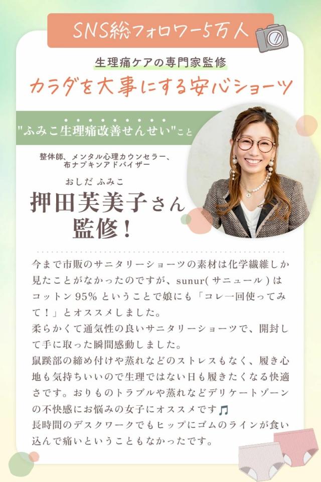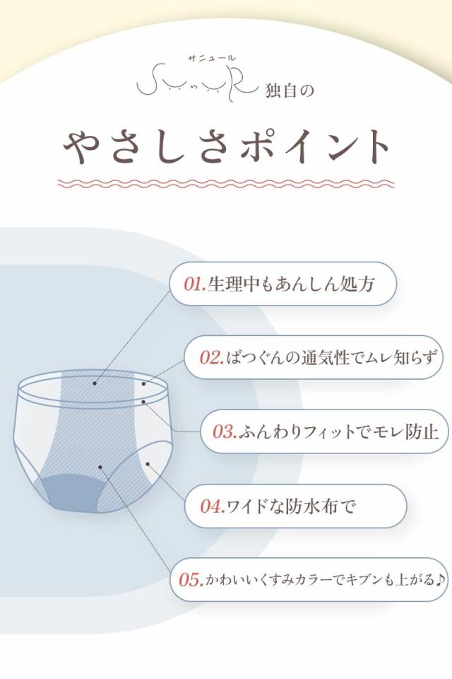 「sunur(サニュール)」は、敏感肌にもやさしいコットン素材と抜群の通気性で、1日中快適に過ごせるサニタリーショーツです。