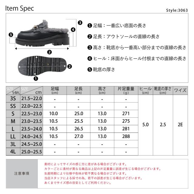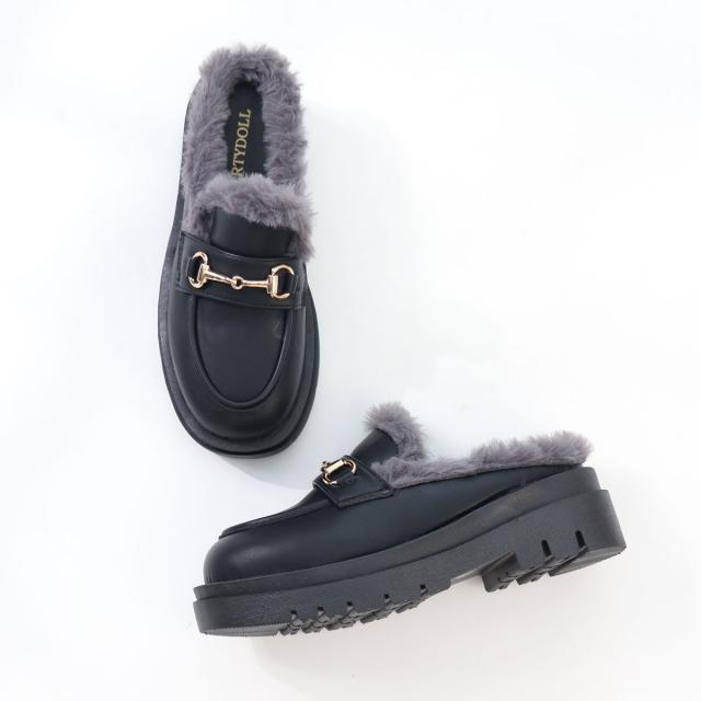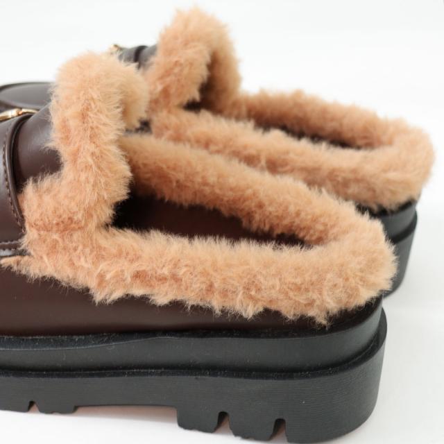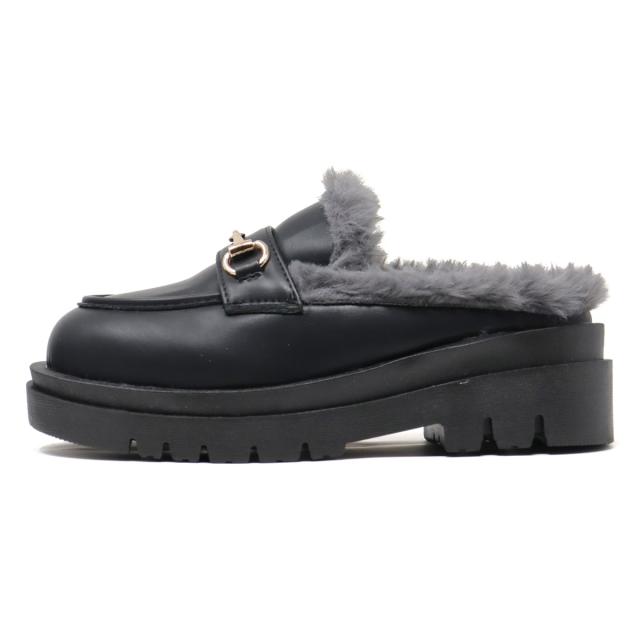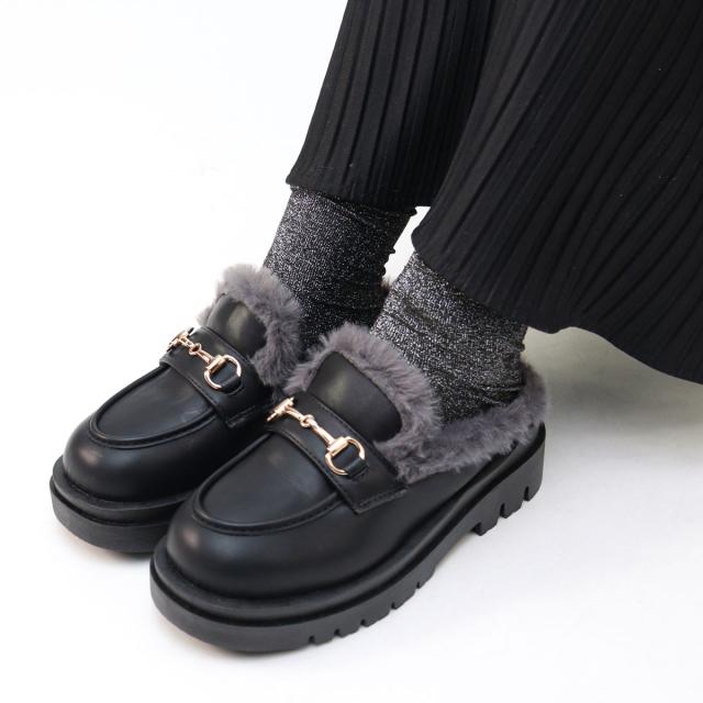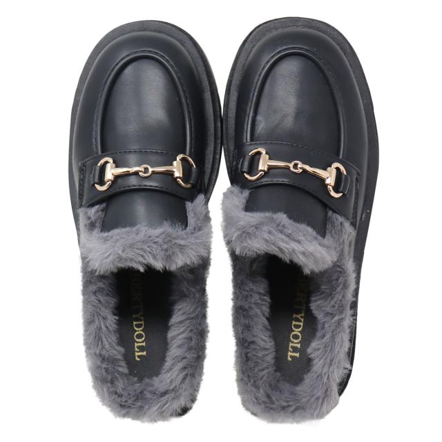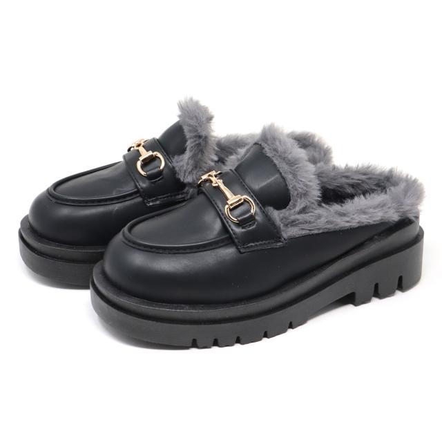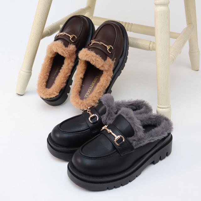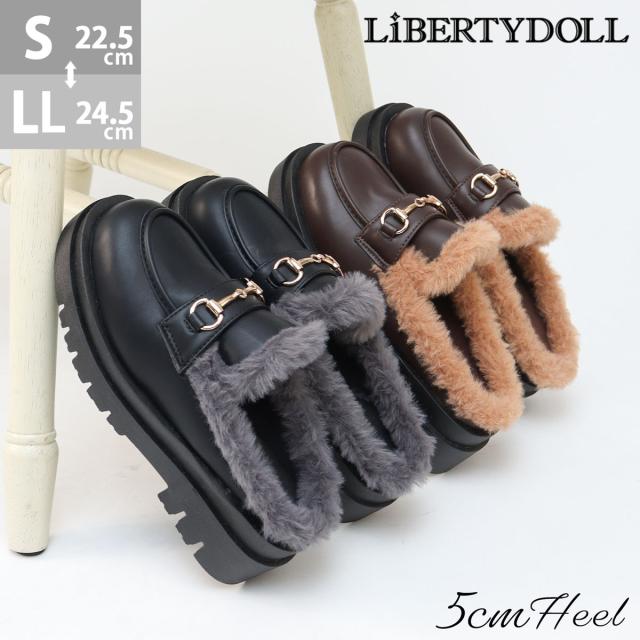 【返品交換不可】フェイクファー ビットローファー かかとなし レディース 軽量 厚底 ラウンドトゥ 5cmヒール 合皮 22.5-24.5cm リバティードール No.3063