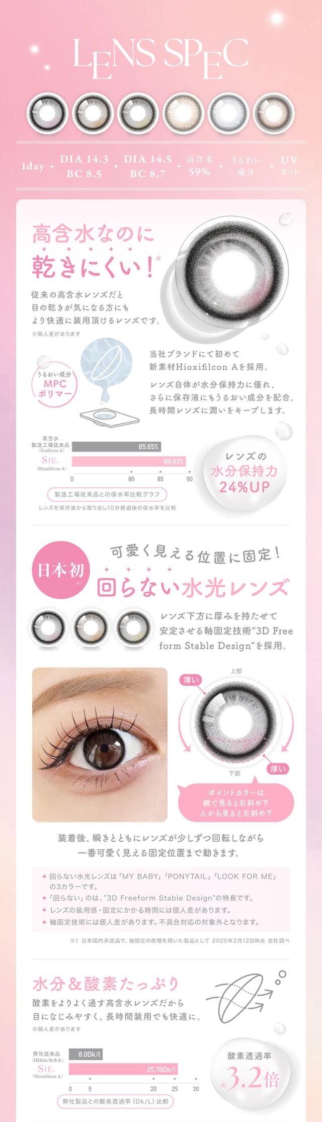 ・BC(ベースカーブ):8.5mm/ティーフロート、ムーンソーダ、チアーアイ、8.7mm/マイベイビー、ポニーテール、ルックフォーミー