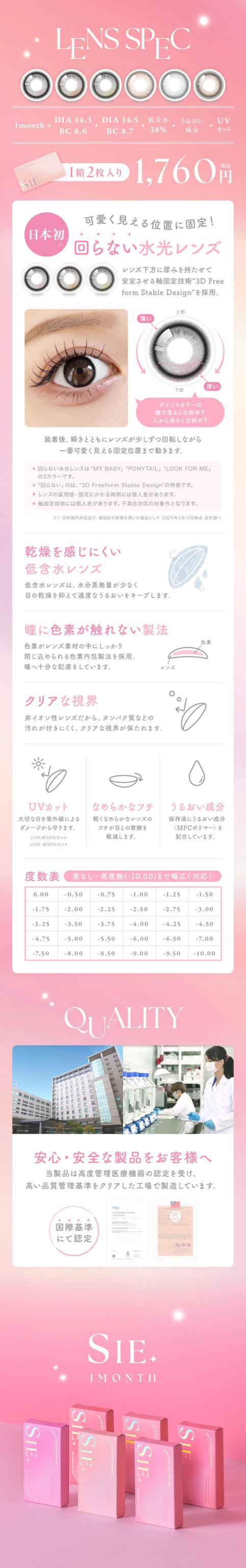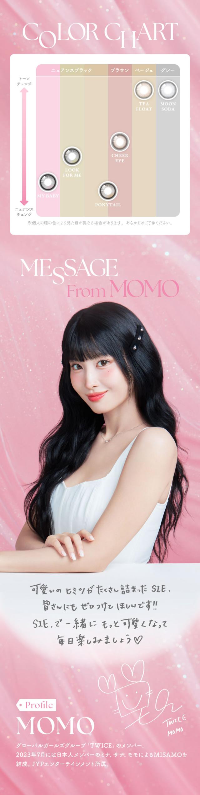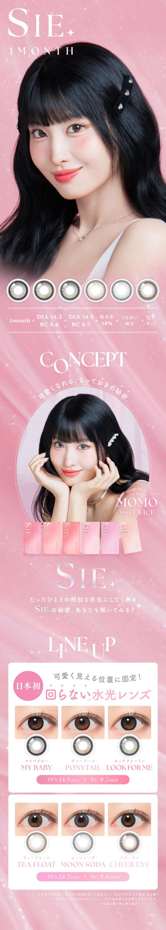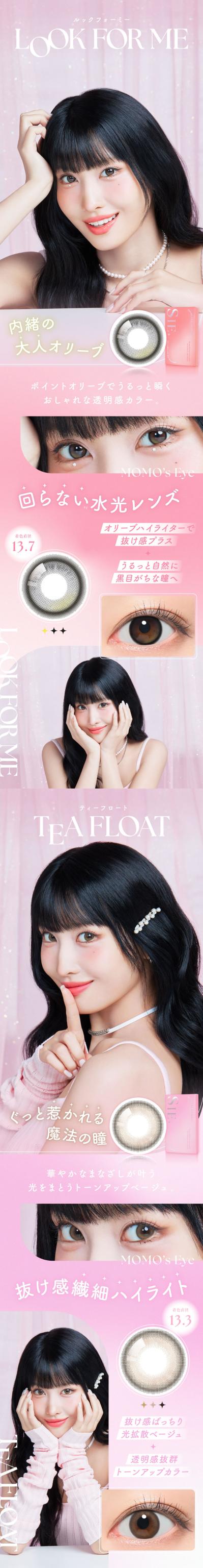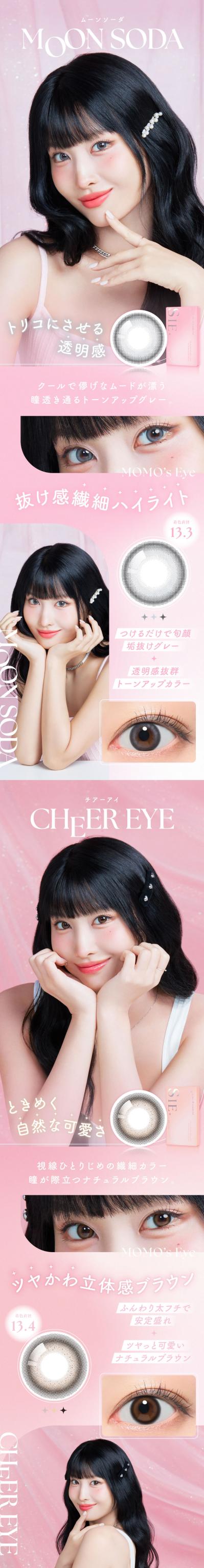| BC(ベースカーブ) | TEA FLOAT/ MOON SODA/ CHEER EYE 8.6mm MY BABY/ PONY TAIL/ LOOK FOR ME 8.7mm |