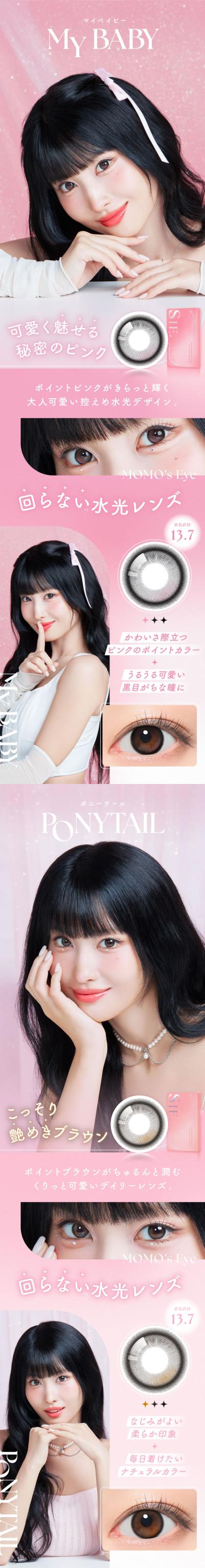 | DIA(レンズ直径) | TEA FLOAT/ MOON SODA/ CHEER EYE 14.3mm MY BABY/ PONY TAIL/ LOOK FOR ME 14.5mm |