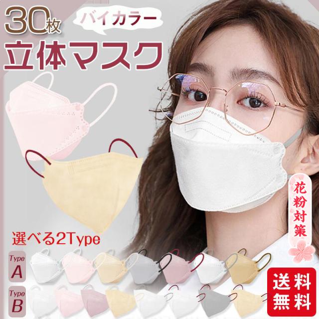 即納 花粉対策 バイカラーマスク 小顔3Dマスク 立体マスク 30枚入 不織布マスク 息がしやすい くすみカラー 小顔 パステルカラー 小さめ 4層 口紅が付きにくいバイカラー 着用快適