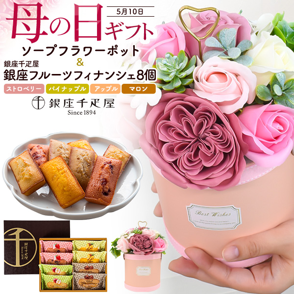 母の日 ギフト 花とスイーツ ギフトセット 銀座千疋屋 銀座フルーツフィナンシェ 8個 詰合わせ 早期お届けも可能 お母さん 誕生日 お花ギフト 全国配送 メッセージカード付き 観賞用 ソープフラワー 造花 可愛い かわいい お花セット ピンク バラ お花石鹸 プレゼント 早割