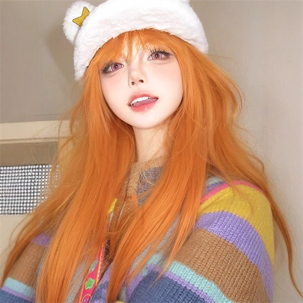 ウィッグ ロング ストレート オレンジ 前髪ぱっつん 前髪あり フルウィッグ ロングウィッグ 可愛い コスレ ロリータ ゴスロリ 原宿 レディース コスチューム 仮装 大人 おしゃれ イベント 学園祭 演劇 舞台