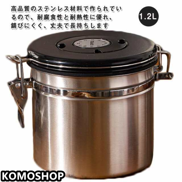| コーヒー豆の敵は、水分、熱、紫外線、酸素、そして、豆が排出する二酸化炭素です。それらが、コーヒーの味や香りの劣化をもたらします。それらからコーヒー豆を守り、且つバルブが有害な二酸化炭素を外に放出します。あなたのお気に入りのコーヒー豆の鮮度を長期間美味しく、新鮮に保ちます。 高品質のステンレス材料で作られているので、耐腐食性と耐熱性に優れ、錆びにくく、丈夫で長持ちします 上蓋に付いているカレンダーを利用して、賞味期限を把握しておくことができます。コーヒー豆をベストな状態で保存していれば、お客様にいつでも最高のコーヒーお出しすることができます 1.2L容量です。多種多様な食物:ナット、レーズン穀物、飴となどの蓄え コーヒー以外にも、ドライフルーツ、茶葉、お菓子、豆、砂糖などの食品の保存にもご活用いただけます | |