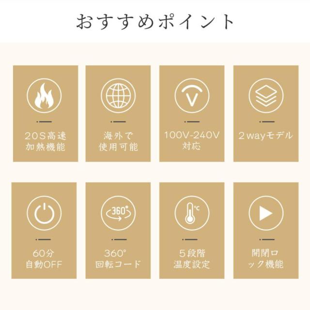 【5段階温度調整可能】電源ボタンを3秒以上長押しすると、電源がONになります。20℃間隔で5段階の温度調整が可能なので自分の髪質に合わせた最適なスタイリング(150℃、170℃、190℃、170℃、210℃、230℃)を実現します。基本的にはストレートなら150?170℃、カールなら180?190℃がおすすめ。約20秒で150℃温度に到達し、忙しい朝、時間ない時もすぐにご利用いただけます。