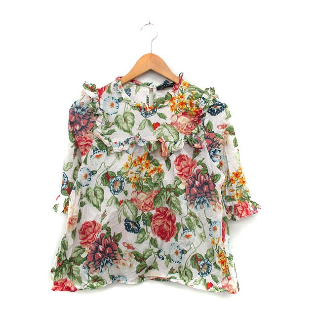 【中古】ザラウーマン ZARA WOMAN ブラウス シャツ 七分袖 フリル コットン 花柄 S アイボリー 白 /KT14 レディース