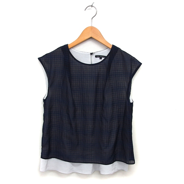 【中古】23区 オンワード樫山 フレンチスリーブ ブラウス カットソー シフォン チェック 透け感 切替 半袖 38 紺