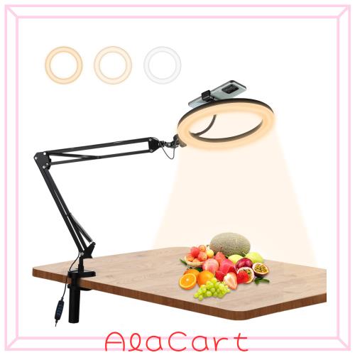 PULUZ LEDリングライトアーム式 26cm 俯瞰撮影用ライト スマホスタンド 料理撮影照明ライト クリップ式 高輝度ライト 3200-5600K色温度 3