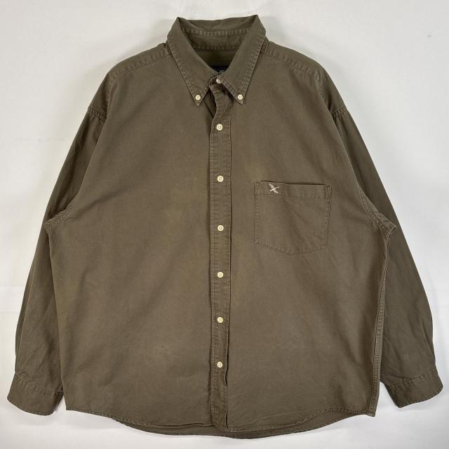 古着 エディー・バウアー Eddie Bauer 長袖シャツ ロゴ 刺繍 ボタンダウンシャツ 胸ポケ L カーキ 無地 メンズ