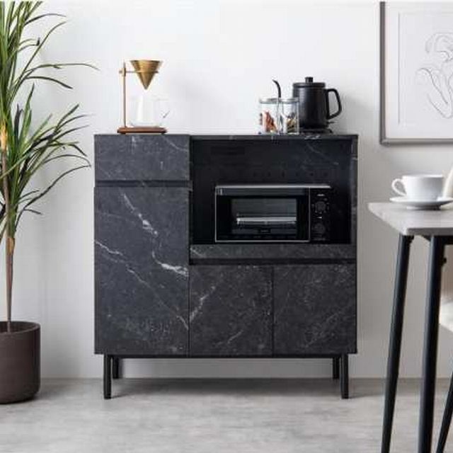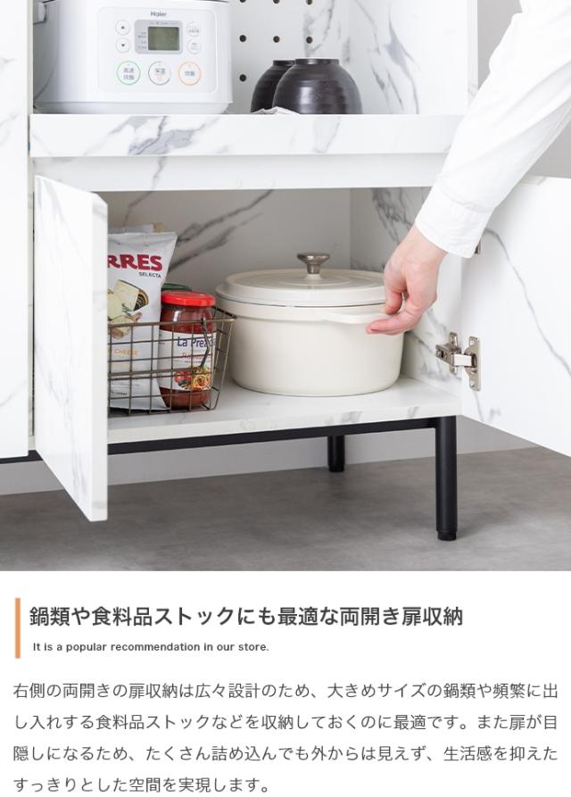 直線的なフラットデザインで、置くだけで落ち着いた大人な空間を演出します。また5種類の収納を備えており、家電や細かい調理道具をまとめて収納可能。
