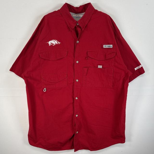 古着 コロンビア Columbia 半袖シャツ PFG フィッシングギア ワンポイント ロゴ L レッド 無地 メンズ