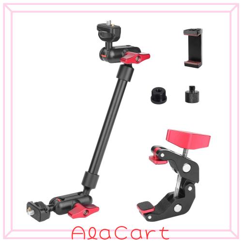 ??【仕様&注意】?【商品仕様】スーパークランプ:2点1/4ネジ穴+1点の3/8ネジ穴; マジックアーム:全長-13インチ、取付ネジ:1/4ネジ 全体の耐荷重:約0.5?まで 「パッケージ内容」改良型のスーパークランプ*1、マジックアーム*1、 1/4転3/8ネジアダプタ*1 、 1/4転5/8ネジアダプタ*1、スマホクリップ*1 ?ご注意:※※ご注意:付属のスマホクリップは緩々固定できない時に、マジックアームの1/4ネジに丸座金を組み合わせてから締めてください。