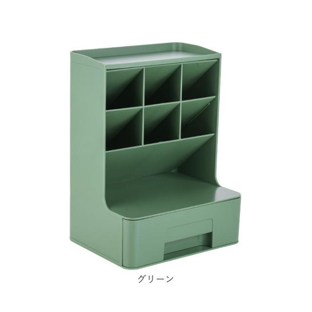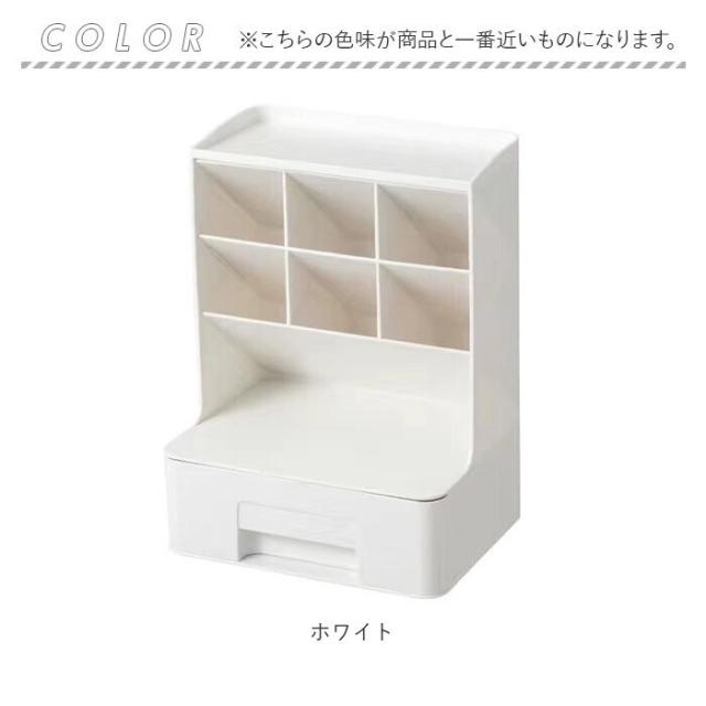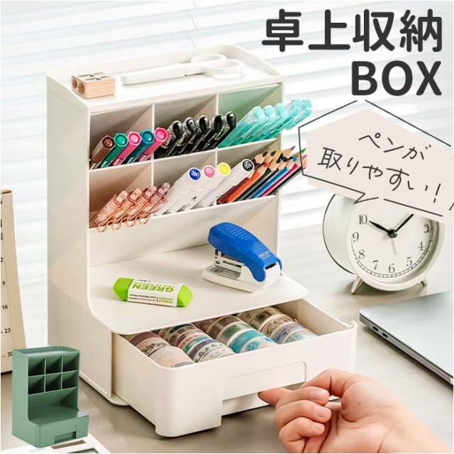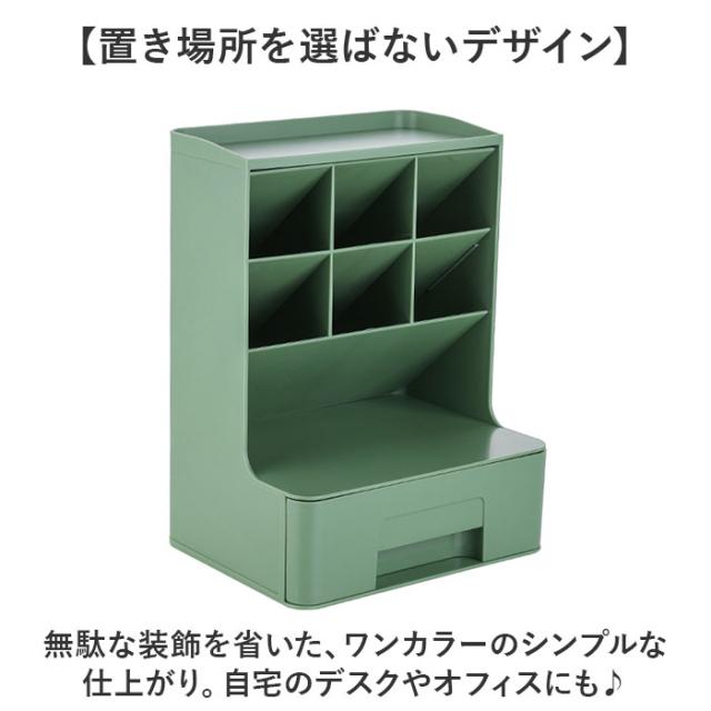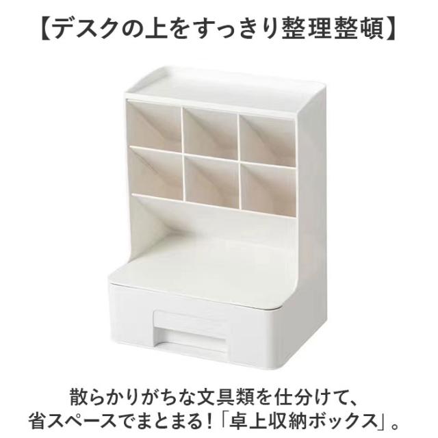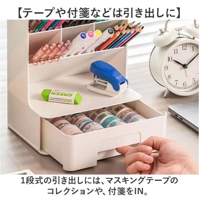 | 商品説明 | 【デスクの上をすっきり整理整頓】 ・散らかりがちな文具類を仕分けて、省スペースでまとまる!「卓上収納ボックス」。 【置き場所を選ばないデザイン】 ・無駄な装飾を省いた、ワンカラーのシンプルな仕上がり。自宅のデスクやオフィスにも♪ 【ペン類をラクラク取り出しOK】 ・斜め45度に設計された、6つのペン収納。種類ごとに分けて、使いたいアイテムが一目瞭然。 【テープや付箋などは引き出しに】 ・1段式の引き出しには、マスキングテープのコレクションや、付箋をIN。 【上部や引き出し上も有効活用】 ・上部には時計やクリームなど。引き出し上には、作業中に使用頻度の高い小物を。 【用途いろいろ!万能アイテム】 ・コスメ類を収納すれば、メイクもスマートにできて便利!使い方は自分次第☆ |