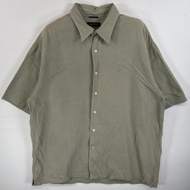 古着 ノーティカ NAUTICA 半袖シャツ シルクシャツ ボックス丈 ワンポイント ロゴ 刺繍 XL グリーン系 無地 メンズ