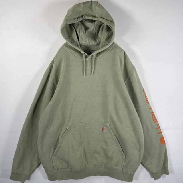 古着 カーハート Carhartt パーカー 大きいサイズ ワンポイントロゴ マフポケット 袖プリント ルーズフィット XL グリーン系 メンズ