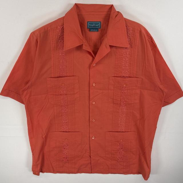 古着 トロピクール TropiCool 半袖シャツ キューバシャツ 刺繍 4つポケ M オレンジ 無地 メンズ