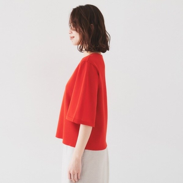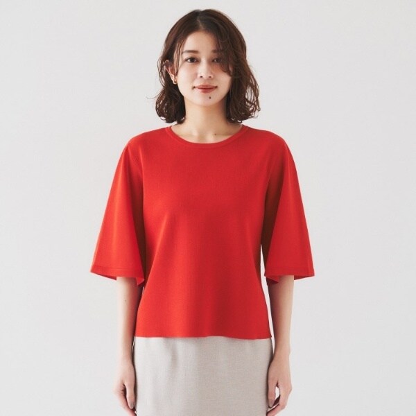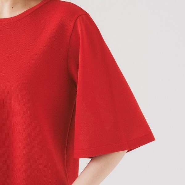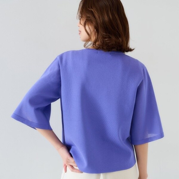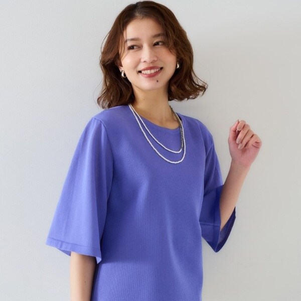 ボディ部分は透け感がなく、袖部分が品の良いシアー感、分量感を抑えた軽いフレアスリーブで、清涼感とドライタッチな質感のプルオーバー。