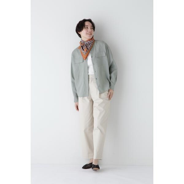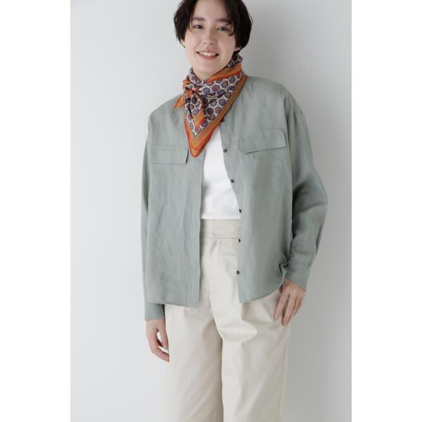 フロントのフラップポケットがポイントのバンドカラーシャツブラウスです。肌離れ感のあるボックスシルエットの前開き仕様なので羽織りとしても着まわせます。袖口はカフス仕様なのでロールアップしてもニュアンスある、洗いざらした麻の清涼感ある心地良さを感じるトップスです。