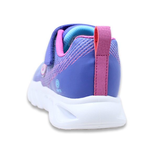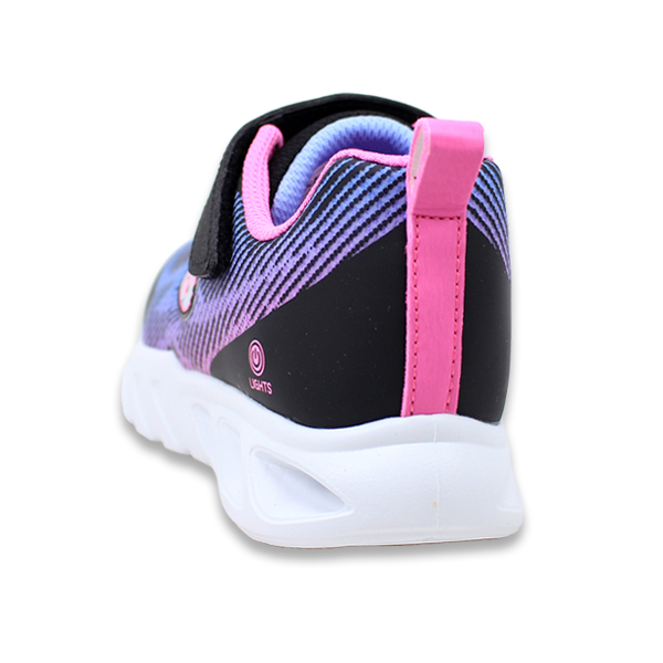 合成素材のメッシュアッパー、クッション機能搭載のコンフォートインソール、スケッチャーズアダプティブクロージャータイプ、ストレッチレースが特長のLEDライト付きスニーカー。