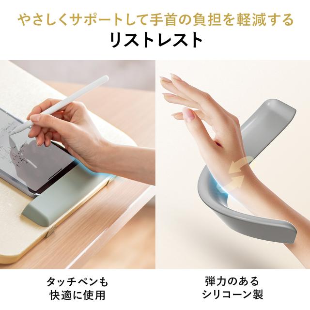 ●天板下部にはリストレスト付きで、タッチペンでタブレットに入力する際に手首をサポートします。