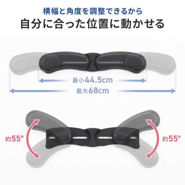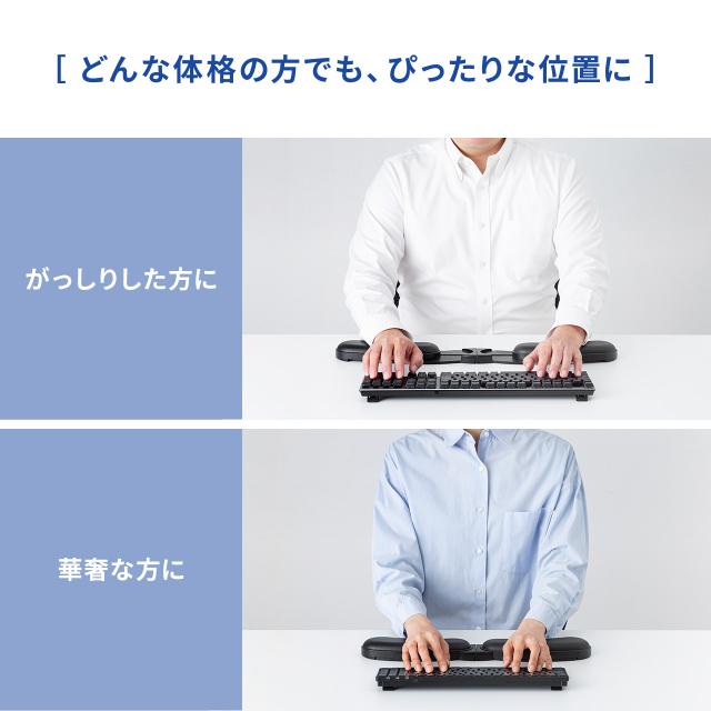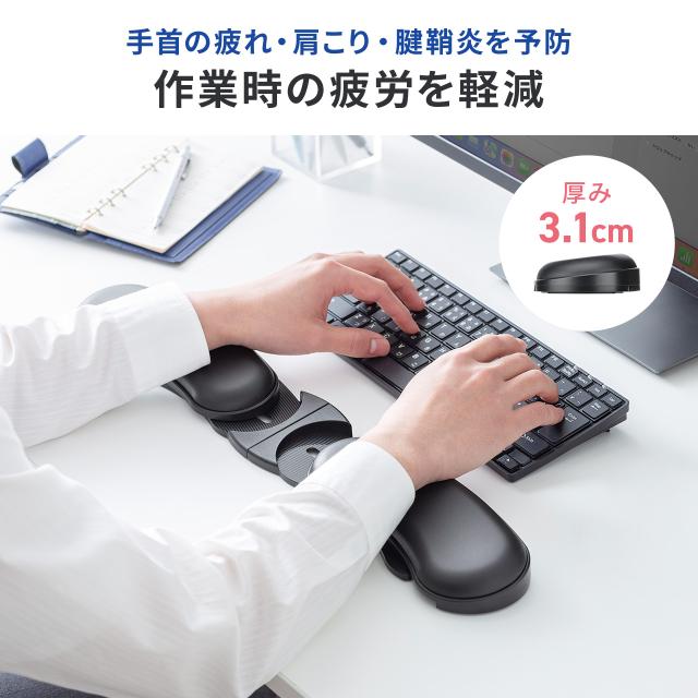 ●幅と角度を調整できる可変式のリストレストです。●最大幅68cmまで対応し、ノートパソコンから大型フルキーボードまで使用できます。