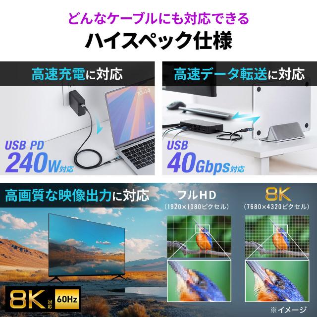 ●8K/60Hzの映像出力に対応し、ドッキングステーションやモバイルモニターとの使用にも最適です。