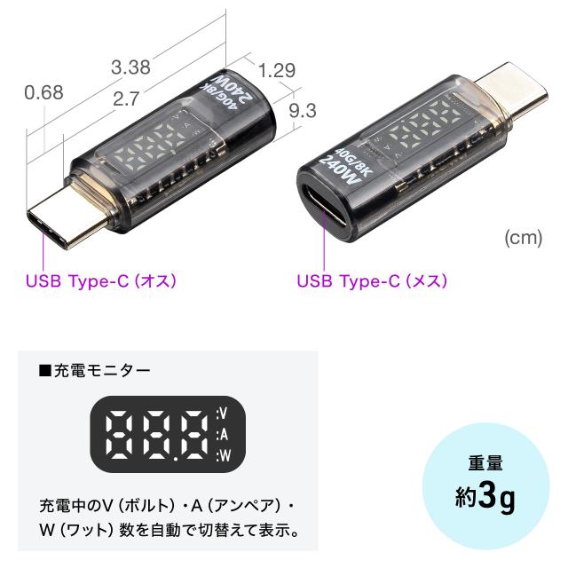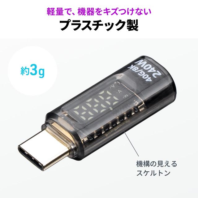 ⇒ご購入の前にご確認下さい充電状況が一目で分かる!電力表示機能付きのUSB Type-C 変換アダプタ・電力チェッカー。V(電圧)、A(電流)、W(消費電力)の3つの表示を順に自動切り替え表示。USB PD 240Wの高速充電。USB 40Gbpsの高速データ転送。8K/60Hzの映像出力に対応。中の基板が見えるスケルトンデザイン。【WEB限定商品】