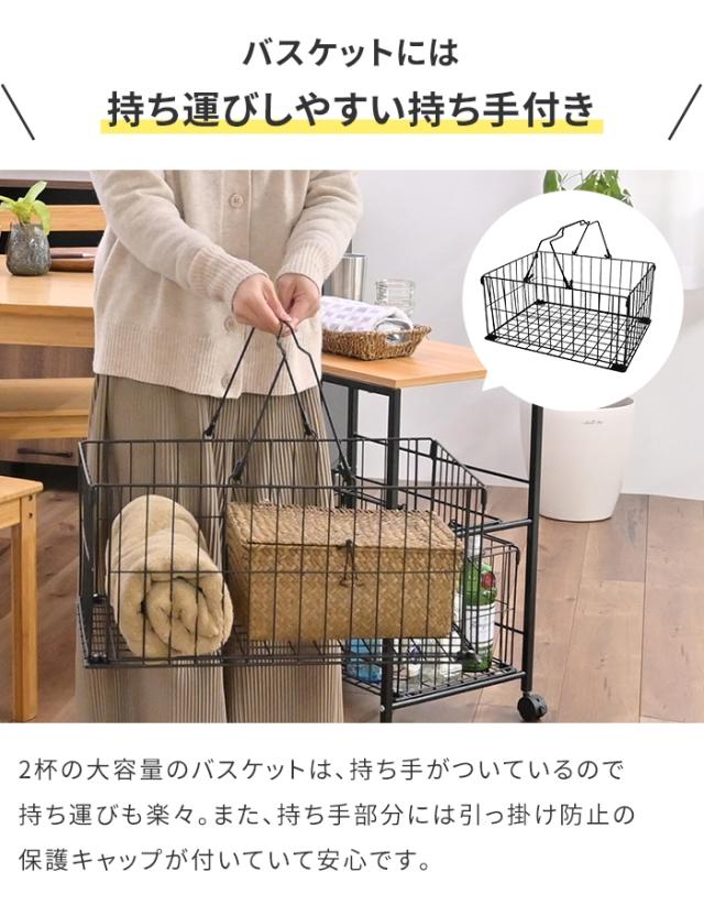 | ・ 幅37cmのスリムタイプ。ちょっとした隙間を無駄なく有効に活用できます。 ・ 2杯の大容量のバスケットは、持ち手がついているので持ち運びも楽々。 ・ バスケットの持ち手には、引っ掛け防止の保護キャップが付いていて安心です。 ・ キャスター付きなので移動も楽々便利。 |