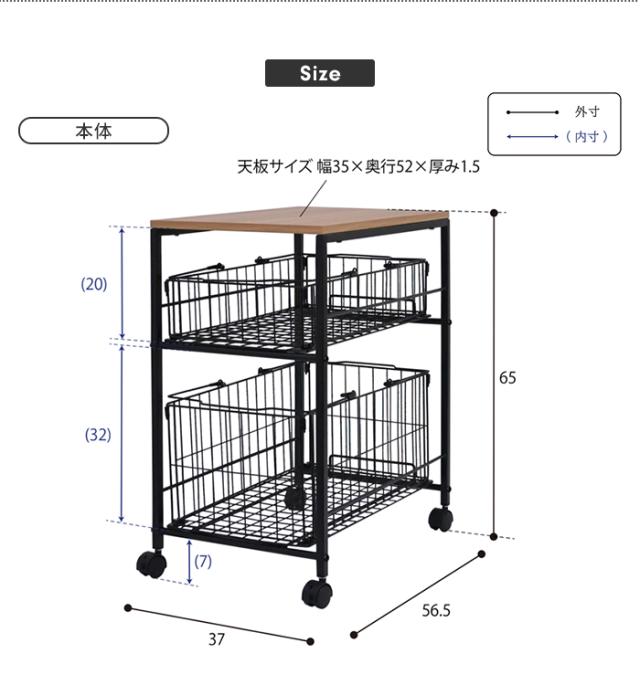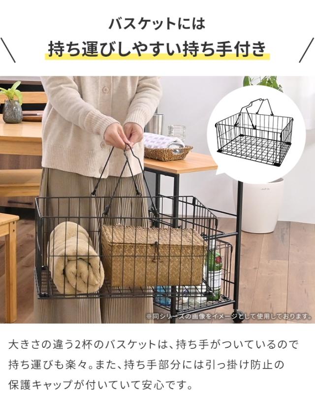 | ・ 幅37cmのスリムタイプ。ちょっとした隙間を無駄なく有効に活用できます。 ・ 小物収納に便利な浅型のバスケットとたっぷり収納できる深型のバスケットが付いています。 ・ 2種類のバスケットは、持ち手がついているので持ち運びも楽々。 ・ バスケットの持ち手には、引っ掛け防止の保護キャップが付いていて安心です。 ・ キャスター付きなので移動も楽々便利。 |