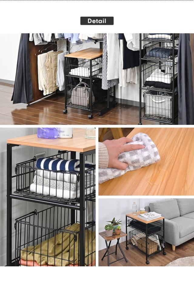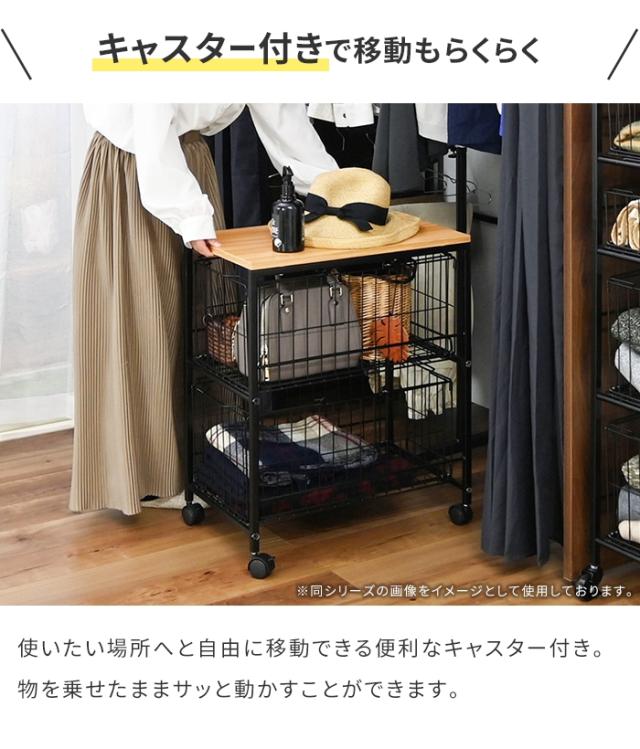 | 奥行き56.5cmで、クローゼット内の奥までしっかり活用できる収納ワゴン。 クローゼットだけでなく、キッチンやサニタリーなど、用途に合わせて色々な場所で活躍します。 美しい木目のナチュラルな天板は、プリント化粧繊維板を使用しています。 フレームにS字フックを取り付けて、引っ掛け収納として使用することができます。 |