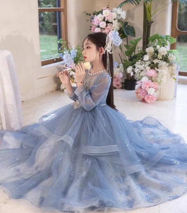 キッズドレス ロングドレス 子供用 長袖 キラキラ 小学生 ドレス ロング丈 春 秋 発表会 キッズ 中学生 演奏会 ピアノ発表会 パーティー ジュニア 100-160cm ブルー da008m6m6jc