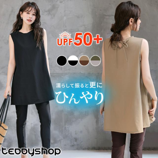 ラッシュガード レディース 上下セット 水陸両用 トップス チュニック パンツ 2点セット 体型カバー 水着 ノースリーブ フードなし イージーパンツ UVカット UPF50+ 急速冷感 スリット バックリボン ウエストゴム 紐 調節 伸縮性 無地 黒 白