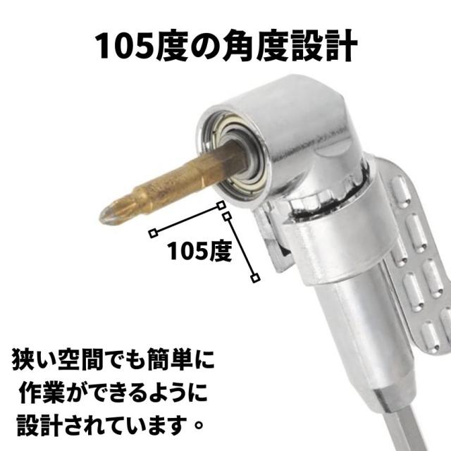 105度の曲がり角設計により、ドリルやドライバーが届かない奥まった場所でも楽々作業ができます。例えば、家具の組み立てや車の整備、電気配線工事など、通常のツールでは作業しにくい環境で大活躍!作業の手間を大幅に軽減してくれる便利なツールです。