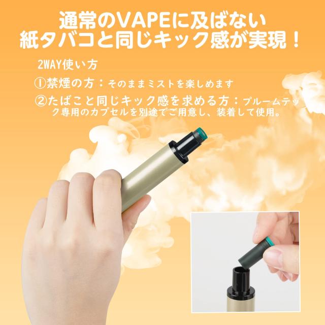 ・たばこ葉が詰まったプルームテックカプセルに使用できるので、通常のVAPEに及ばない強いキック感が実現!禁煙の方はカプセルなしでそのままミストも楽しめます。