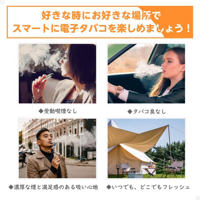 ・細身でスタイリッシュなデザイン、手に収まるサイズでどんな場所でもスマートに電子タバコを楽しむことができます。