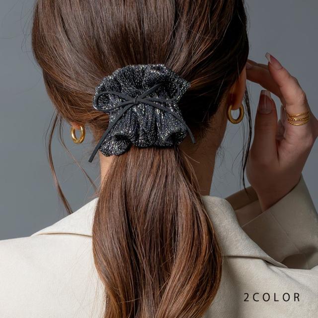 ラメ入りギャザーが大人可愛い、スエード調リボン付ポニーフック。程よく広がったラメ入りギャザーが上品で大人可愛いデザイン。髪の毛にサッと差し込むだけで簡単に華やかなヘアスタイルに仕上がります。