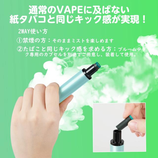 ・たばこ葉が詰まったプルームテックカプセルに使用できるので、通常のVAPEに及ばない強いキック感が実現!禁煙の方はカプセルなしでそのままミストも楽しめます。