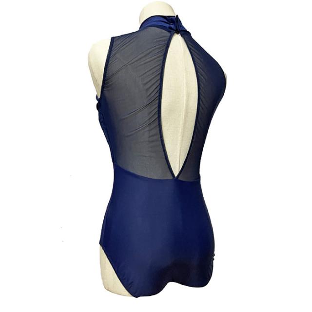 透け感あるメッシュで美しく、肩や背中はすっきり見せてくれます。胸元は可愛い花柄の刺繍付き フックタイプ 練習着 バレエウェア 紺 ネイビー おとな デザイン