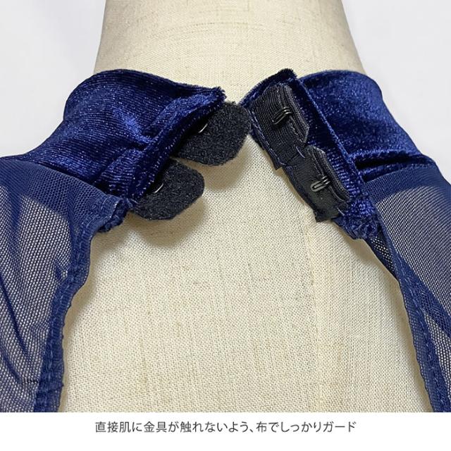背面は腰部分まで開いたメッシュ素材のバックオープンタイプで、肩甲骨の動きを妨げず、背中のラインを美しく見せてくれます。