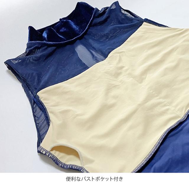 異素材の組み合わせとフラワーモチーフの刺繍が美しい、ハイネックのレオタードです。